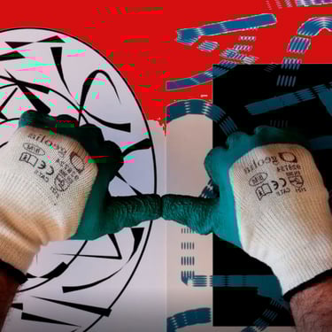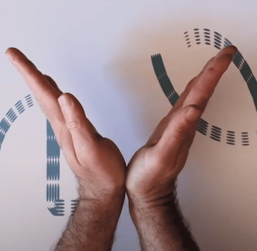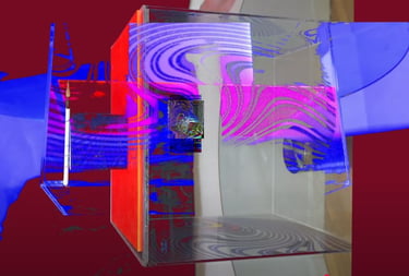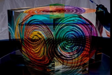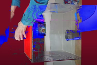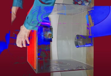 Y de nuevo las manos, a veces enguantadas, asépticas, y otras veces no, naturales, que tocan y mueven formas y materiales, que se mueven con un pincel con creatividad pictórica simbólica, que introducen en sus acciones cables en el cubo, como metáfora de comunicación, de luz, de lo digital y electrónico. Manos que tocan y mueven objetos, piedras, libros con grafías, telas, superficies, todos ellos con carga simbólica y significante. Y el cubo, bien como dibujo, rodeado de escritura de textos antiguos, de otras culturas, bien transparente, como contenedor de algunos de estos elementos, que mete y saca, o que superpone, pero también como geometría sólida y contundencia desestabilizada, fluidificada, flexibilizada.