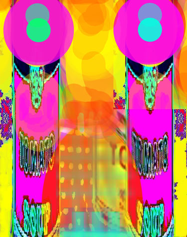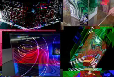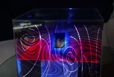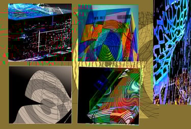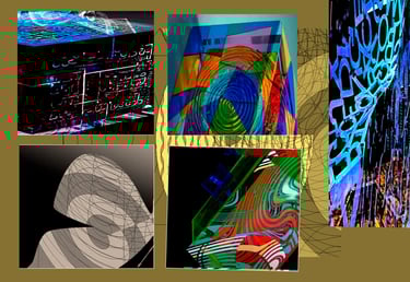 Dibujos de naturalezas y de azules, que evocan líquidos y cielos primigenios se suceden, para mostrarnos la frase “ Ellas volvieron de la eternidad”. Mientras formas acuosas, curvas y envolventes ofrecen poemas de mujeres antiguas que se liberan, a la vez que formas y colores, provenientes de fusiones con ingredientes de naturalezas primigenias de fuerzas femeninas y de construcciones y gramáticas electrónicas, son recorridas, de vez en cuando, por poemas y afirmaciones que nos remiten a fusiones de evocaciones de mujeres sabias antiguas, del fondo de la historia, sus representaciones y mitos, y la representación de la identidad genérica, entre lo femenino ancestral y las nuevas ciborgs.
