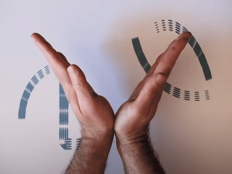 Finalmente, la tercera videocreación, Coreografía 555. Geometría sustentable, cuyo inicio de la presencia de la artista repetida, en cuanto a esa multiplicidad y flexibilidad identitaria, es idéntico a la videocreación El origen está en lo femenino, a modo de carta de presentación de intenciones. Y, además, ya desde el inicio, la afirmación de la importancia, aquí, de un tipo de geometría, la sustentable, basada en la numerología, con protagonismo del número 5. Un número que se vincula a los sentidos y al cuerpo, son cinco los sentidos humanos, cinco los dedos de pies y manos. Pero también un número con una rica y amplia simbología asociada a la libertad, la flexibilidad, el cambio, la curiosidad, la aventura, a la unión de la dualidad y la apertura a nuevas posibilidades, el descubrimiento y el deseo de vivir, así como la armonía. En cinco es la suma de dos y tres y se sitúa en el medio de los nueve primeros números, como símbolo de intersección, armonía y equilibrio. Para los pitagóricos el número cinco, como geometría del pentágono, como estrella de cinco puntas, era esencial, incluso como plasmación gráfica de la proporción áurea, y ejemplo de un nivel elevado del número pi. Un pentágono estrellado que ha sido objeto de meditación por los pitagóricos, quienes lo llevaban tatuado en su cuerpo. Figura pentagonal que alude, además, morfológicamente, a la naturaleza, a las flores de pétalos dispuestos con formas pentagonales, o a determinadas formas de hojas y de semillas, e incluso algunos animales, como la estrella de mar. También como símbolo de la unión del cielo y la tierra, del orden divino, y de la integridad humana. El pentágono, suma del uno y del cuatro, es, además, símbolo del equilibrio entre la materia y el espíritu.